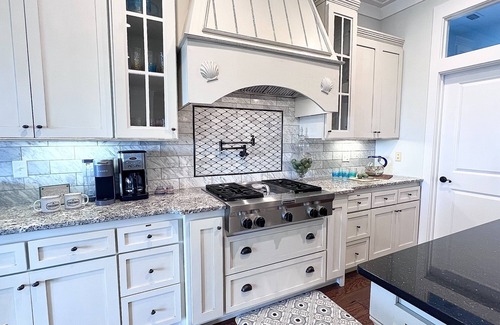 Beautifully appointed, professionally decorated with high end furnishings with ample space for extended family members. The well-appointed kitchen enjoys granite countertops, two sinks, warming drawer, pot filler faucet over stove, convection microwave and oven. The dining room table seats 10. The kitchen breakfast bar seats four and is perfect for coffee and conversations and also works for a quick snack or puzzles and games. We provide a high chair as well. The dining and living area enjoys direct access to the covered porch with plenty of seating and a patio table. There is a powder room for guests on the main level.