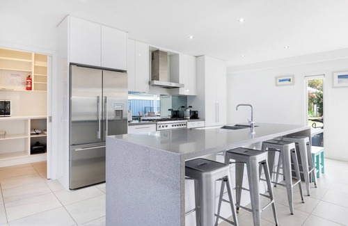 The kitchen is also a feature, again cleverly designed and fully equipped with brand new top shelf appliances, walk in pantry and stone Italia bench tops to satisfy even the most talented chef. With a massive 6 burner Smeg oven/cooktop, huge double door fridge and Sweedish dishwasher, you can cook up a storm, clean up and be on the beach in no time at all!