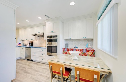 In addition to thoughtful decor touches, this gourmet kitchen has state-of-the-art, stainless appliances, including a French door fridge/freezer with ice maker, a glass stove top, oven, microwave oven, dishwasher, and oversize farmhouse-style sink with adjustable spray nozzle. The kitchen is fully equipped with all-new pots, pans, cookware, dishware, bakeware, utensils, coffee mugs and glassware, as well as a new cappuccino/espresso maker, new kettle, new blender, food processor and toaster.