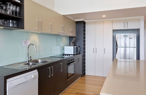 Ground level has three bedrooms including 1 king bed, 1 queen bed and 2 single beds. There is a large bathroom with a shower over a full sized bath and a European style laundry with washer and dryer facilities.