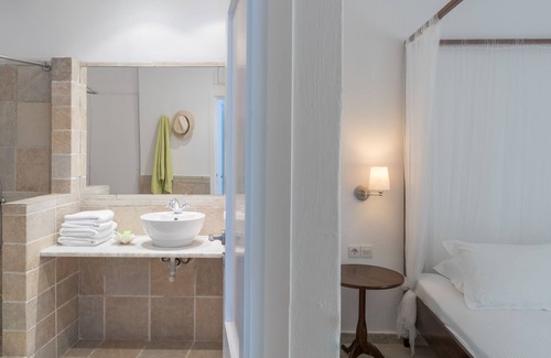 Skiathos Holidays Resort offers 5 3-bedroom villas, right behind the amazing sandy beach of Vromolimnos! Each villa is divided in two levels. On the ground floor are the bedrooms and bathrooms with shower. The bedrooms are 3 in total. One master bedroom with its own bathroom, and 2 bedrooms that share the other bathroom. Just outside the bedrooms there is a private garden and at the end of it there are some steps leading you to the main garden of the resort.