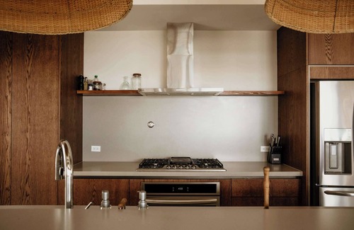Fully equipped with stainless steel appliances: fridge, stove, oven, dishwasher, microwave, coffee maker, toaster, and blender. Includes cooking utensils, cookware, cutlery, wine glasses, and serving ware.