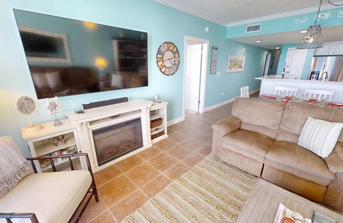 Step inside to a bright and beachy-themed retreat with driftwood accents and warm earth tones, creating a relaxing coastal vibe. The spacious living room features a plush sofa and loveseat, a large wall-mounted flat-screen TV, and a cozy fireplace entertainment center—perfect for unwinding after a day in the sun.