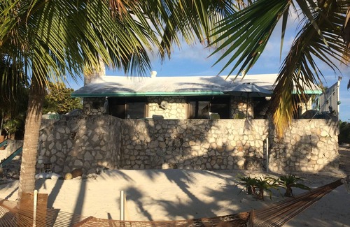 You will fall in love with this beautiful 1,400 sq. ft. five-room stone house, located directly on the leeward side of a gorgeous, secluded beach. Our two bedroom home is positioned among many palm trees, just steps from one of the prettiest pristine beaches you will ever see. The beach gradually extends -- coral free -- into the blue water. Further offshore are reefs that are perfect for fishing, scuba diving or snorkeling. This home sleeps four, and has two bedrooms with king size beds and one bath. Linens and towels are provided. The fully equipped kitchen has a microwave, blender, toaster, coffee maker and washing machine. The living room has a fireplace, radio, CD, TV/VCR and a large selection of movies. The 42 x 17 foot patio has a gas BBQ and lounge chairs and is perfect for sunbathing. Included with the house are 2 kayaks, perfect to take into our creek for bone fishing, sea turtle watching and snorkeling.