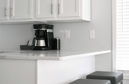 Beachside Bliss is a great spot for a quick getaway, but it’s also got enough space for a longer stay by the lake. The unit is anchored by its common area, with an electric fireplace for effortless warmth and ambience. There's a leather sofa sectional facing the fireplace (and a 65" smart TV), plus another sofa and an easy chair, plus a roomy walk-in closet in the entryway. The common area flows into a lovely corner dining nook with windows on two sides for some beautiful natural light. There's seating for six at the table, and bar seating for two more. The kitchen features all-new stainless appliances and plenty of gorgeous marble countertop space. It’s outfitted with everything you need to whip up a feast with all the amazing local food you can find around Bayfield! Open the closet along the corridor between the kitchen and the entryway and you'll find a washer and dryer--another feature that makes this place great for extended stays!
