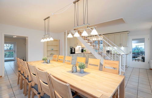Holiday for the extended family or with friendsThe apartment offers you 11 beds (4 double beds / 1 single bed + 1 bunk bed). Additionally there is the possibility of toddler bed (travel / child bed) in 2 bedrooms. In addition, up to 2 dogs are welcome here. Feel at home on 180 m2 ... Relaxed in the sun on your own terrace with 2 beach chairs or in bad weather in the fresh air in the covered patio on the comfortable lounge furniture. You enter the apartment from the west side of the entrance hall / the laundry in the then spacious fully equipped country kitchen, equipped with 2 solid dining tables and matching chairs (core beech) for 12 people. From the kitchen you can make yourself comfortable on blue / gray upholstered furniture in the conservatory. Here you will find a great stove, a flat screen TV and direct access to the covered patio with a large lounge suite. The ground floor also offers a barrier-free bedroom (white / antique furnishings) with adjacent also accessible modern shower room. The upper floor is at your disposal with: - 1 bedroom with 3 single beds- 4 bedrooms each with a double bed- 3 shower roomsHere everything is decorated in modern country style in the colors gray / white and decorated with maritime accessories. Unfortunately, it is not possible for us to accommodate youth groups in this apartment, due to the equipment and design of the apartment.