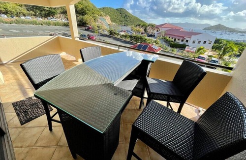 The unit is apart of a freestanding building that has 15 units. THERE ARE FLIGHTS OF STAIRS YOU MUST WALK UP, THERE IS NO ELEVATOR. It is a gated building with one assigned parking space, that requires a fob to access. Our unit is located on the 1st floor. The beach is a 2 minute drive away! Unit is fully furnished with incredible view from large balcony. One split A/C unit that cools very quickly! Unit includes expanded cable and high speed internet! Due to frequent power outages on the island, we have a generator to power every unit and all common areas. The unit is not wheelchair accessible.