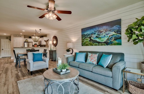 Our Condo name is “Beach Retreat” located on the Gulf in Destin/ Miramar Beach. Maravilla - Top rated condo complex. All completely new inside and designed with our guest’s experience in mind. Crisp white shiplap Wall. Extra large space in kitchen, living room, both bedrooms and laundry closet. Plus two adjoining full beautiful baths. Very open, airy with all new bedding and furniture. Maravilla is a favorite Destin / Miramar Beach condo for families and adults. We are also pet-friendly for pet owners and non pet owners alike. All flooring is the newest wood-like vinyl plank. No carpet. Very beach and upscale inside.