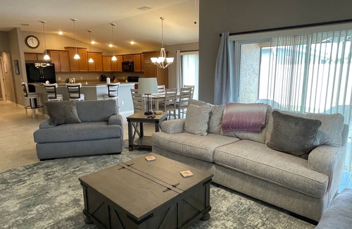 You'll feel welcomed and relaxed as soon you open the front door to your beautifully decorated home away from home. The large open kitchen is complete with everything you'll need to prepare and serve meals or entertain new friends. The living room offers plenty of comfortable seating if your entertaining friends & family or just enjoying your favorite television shows. The master bedroom has a comfortable king size bed, large walk in closet, and a private master bath. The master bath offers a walk-in shower and his/hers vanity sinks. The guest bedrooms both have comfortable queen size bed for your guests to relax & enjoy while feeling at home. The bedrooms and both bathrooms are set up with extra towels and linens. Need a getaway area to relax and enjoy some quiet time? The charming enclosed lanai offers seating for you to enjoy reading the morning paper and while enjoying your coffee or juice. There is also additional seating with a large table and comfortable chairs on this wrap around lanai. It's a great place to sit and relax at the end of a busy day of activities or grilling out with new friends heading to town squares to dance the night away!