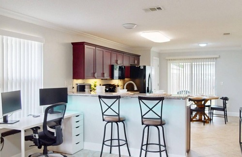 The open living area is bright and welcoming, with cozy seating, a smart TV, and easy flow into the kitchen and dining spaces. Just off the living room is a dedicated workstation with two monitors and a comfy office chair—ideal for remote work or checking in between beach adventures.