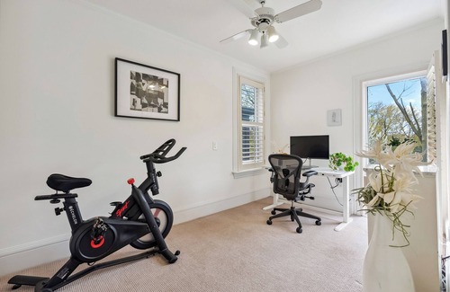 There are 3 spacious rooms with queen size beds on the 2nd and 3rd floors. On the second floor, there are two bedrooms, a bathroom, and a convenient office space equipped with a standing desk, perfect for working from home. The third floor boasts a master bedroom with its own desk, a private ensuite featuring a spa bathtub, and access to a personal deck.