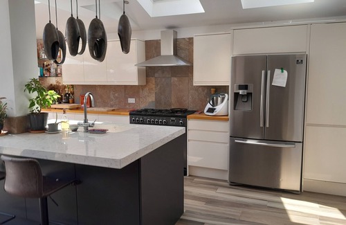 Stylishly referbished large comfortable family house, with lovely garden. Located in exclusive leafy area, but with easy access to London for sight seeing, by public transport, whilst staying in quiet haven. River at the end of the road, for walks and water fun, swimming, paddleboarding, kayaking. Inside outside living, with huge bifold doors opening onto lovely semi circular patio equipped with outdoor corner sofa and dining table with central parasol, and BBQ. Fruit trees and lawn stretch beyond. House has several comfortable seating areas for socialising and relaxing, a fully equipped kitchen with large island inset with stylish stone sink, big double fridge freezer, 5 hob range cooker with double oven, thermomix for easy cooking, dishwasher, washing machine and cocktail bar! House is newly insulated against cold and heat, underfloor heating throughout the groundfloor and airconditioning up top, you'll never be too hot or cold! Nearby shops pubs and restaurants within easy walking