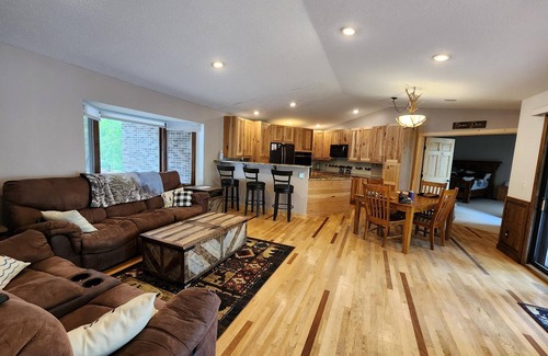 Unique, spacious, open floor plan home, sleeps 7-12 comfortably, custom hardwood floors in the living and dining areas, vaulted ceilings, carpeted sleeping areas. Central heat and air for your comfort. The lake, which is just steps from the walkout lower level patio or upper
