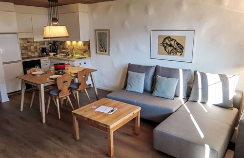 The open kitchen is well-equipped with 3 hot plates, an oven, dishwasher, toaster, kettle, raclette grill, and a fondue set (cheese), ensuring you have all the necessary appliances for preparing meals during your vacation. The apartment also includes a shower/WC for your convenience. Outside, you can enjoy the patio area with terrace furniture and a box-room.