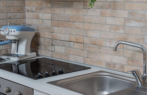The apartment is well-equipped with various amenities to ensure a comfortable vacation stay. The kitchenette is furnished with a dishwasher, 4 induction hot plates, a kettle, and an electric coffee machine. The bathroom features a shower, bidet, and toilet. Air-conditioning and forced-air heating are available to maintain a pleasant indoor temperature. The terrace is roofed and includes terrace furniture and a sitting area, offering a panoramic view of the sea.