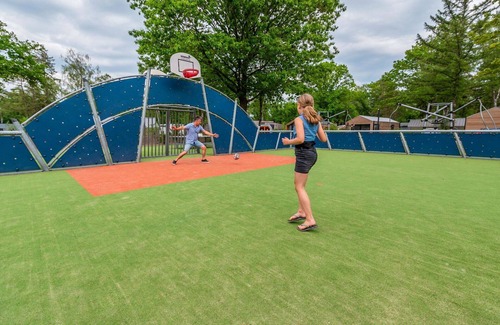 EuroParcs De Hooge Veluwe is a vacation rental located 8 km from the center of Arnhem, Netherlands. The property boasts a natural setting with trees, meadows, and a pond, along with amenities like a swimming pool, indoor pool (seasonal availability: July 1 to August 31, open from 9:00 AM to 4:00 PM), and facilities for boccia and children's playground. It offers a reception area, restaurant, sauna, fitness room, infrared sauna, trampoline, shopping facilities, and a shared washing machine (extra charge). Parking is available, albeit with a limited number of spaces, and an EV charging station is provided.