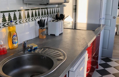 - a kitchen with plenty of storage space, 3 induction hobs, microwave and oven, dishwasher and fridge freezer. Cookware. Window and French window opening onto the balcony