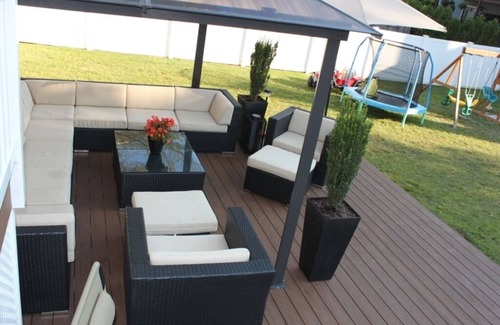 The house was built in 2012 with a very high standard. There are hardwood floors throughout the house accompanied by beautiful tiles in all the bathrooms. The main floor boasts 9 ft ceilings with some amazing trim work along the ceilings and floors. The dining room seats 8 with room for more by just adding the extra leaf. Upstairs there is the master bedroom with a king size bed, spacious walk-in closet, and a full bathroom with dual showerheads. The 3 other bedrooms all have queen-size beds with 2 of the rooms having built-in closets and the largest of the rooms has a pull out couch which can sleep two. There is also a full bathroom with a bathtub on this floor. From the kitchen there are double sliding glass doors that open up to a large deck, patio area, and very spacious backyard.(100x75ft).