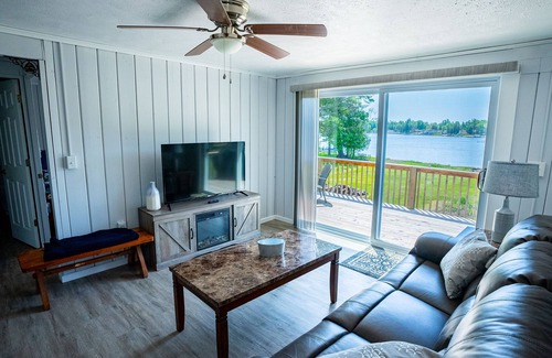 Two bedrooms in the upstairs- one with a queen bed and one with a full and a twin. Bathroom and full kitchen. Living room overlooks the lake.