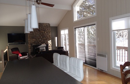 Only 1.5km from Mont St-Sauveur mountains, ski hills, waterslides, outlets and cosy restaurants. This beautiful 1400 square feet house is located on a 20,000 square feet lot. It has 2 living rooms, 2 fireplaces, 3 bedrooms and 2 full bathrooms. Floor is made of hard wood and ceramic tiles. This is an open concept house with a 12 feet high cathedral ceiling with many large windows providing a magnificent view of the nature. The house is very well located, only 45 minutes from Mont Tremblant and 45 minutes from Montreal. It includes the following: Stove / Fridge /Dishwasher / Washer & Dryer Micro wave / Coffee Maker / TASSIMO/ Toaster Plasma Televisions (2) / Blue Ray (1) / WIFI Fireplaces(2) Queen beds (2) / Single Bed (1) / Single Mattress (1) /Hide-bed double size (1) Parking for 3 cars