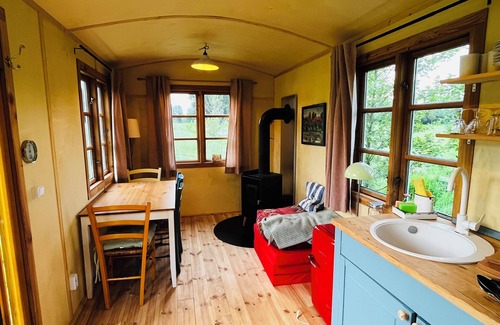 Beautiful circus wagon on the sheep pasture is located in Oetzen. Beautiful circus wagon on the sheep pasture provides accommodation, featuring Fireplace/Heating, Entertainment, Barbecue/Outdoor Cooking, among other amenities. This Cabin features Fireplace/Heating, Entertainment, Barbecue/Outdoor Cooking, to make your stay a comfortable one.