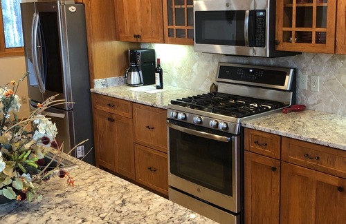 With over 3,000 sq ft of finished living space you have plenty of room to spread out and enjoy your stay. We have decorated our home with beautiful rustic log furnishings. We have three bedrooms and a bonus room that will accommodate eight adults. The house also has three full bathrooms, two stone fireplaces, a finished entertainment area that includes a large screen Smart TV, shuffle board table and bar for your enjoyment. The kitchen is fully supplied for all your culinary needs. A washer and dryer are provided for you convenience. Three seasons room and large outdoor deck with gas grill.
