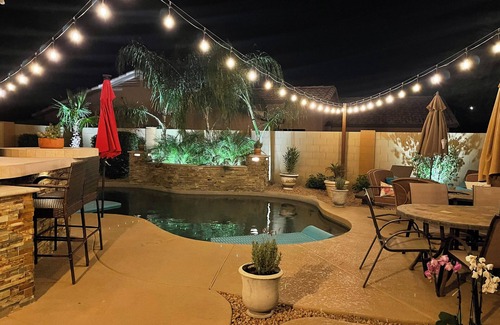 Beautifully appointed home in a great Goodyear location with quick access to shopping, dining, golf and entertainment. Large, open rooms throughout this comfortable home make it easy to hang out and unwind. Enjoy a spacious loft with plush couches where you can catch up on your reading or simply grab a quick nap. Luxurious outdoor living includes a built in BBQ and a gorgeous pool with soothing water features. Go for a swim and then gather around the fire pit with family and friends. Generous outdoor seating areas compel you to enjoy your stay while you’re here. Grassy areas and lots of tropical plants add to the desert oasis experience.