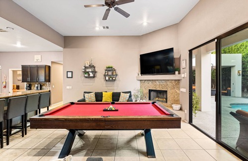 Modern design house with 4 bedrooms and 3 bathrooms. The house is in excellent shape with new furniture and beds in all the rooms. It has a fully equipped kitchen for all your cooking needs. The backyard has a heated pool and Jacuzzi with a multi color light display in the water. The best part of this house is the barbecue grill which has been recently built with a full sink, gas grill, refrigerator, and trash bin all in the convenience of the backyard. Great home to have an amazing BBQ with your family and friends and enjoy the water in the desert heat. The patio area which contains the fully equipped grill also has a built in fire pit with seating for cold nights.