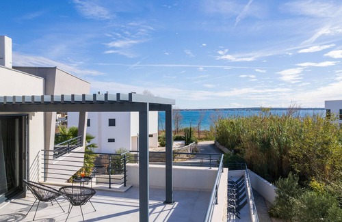 Villa Roca is located in the heart of Privlaka and represents everything you have always dreamed of. Beautiful location, close to the clear sea, luxury vacation, sauna and swimming pool are just some of the advantages that this modern villa offers. Privlaka is characterized by beautiful sandy beaches and quiet bays and is a perfect place for all those who come in the company of their own families with children, while on the other hand it is ideal for groups of friends who want to relax and have fun. Villa Sunflower was built in 2021 in a modern architectural style, has 330 m2 and is only 50 m from the sea. Villa Sunflower can accommodate a maximum of 8 and ideally 6 people and accommodates its guests on the upper floor in 3 bedrooms with double beds and private closets. All rooms have their own bathroom with shower. Two of these rooms have their own balcony, while the third has a terrace. From all rooms you can enjoy the view of the sparkling Adriatic Sea. If you are traveling with children, a folding bed (60x100) is also available. The villa itself has two more ordinary bathrooms, also with showers, and you can use the washing machine, dryer and iron. The villa is fully air-conditioned, underfloor heating and cooling is only available in the bathrooms and additional facilities such as a fully equipped kitchen with everything you need to prepare your favorite delicacies are always at your disposal. Next to the kitchen there is a dining room with a table for 8 people, next to it a living room with a corner sofa, coffee table and TV and from there there is an exit to the terrace. On the outdoor terrace you can cool off in a heated pool of 30 m2, sunbathe on the 6 sun loungers that surround it and next to the pool there is a sauna where you can completely relax. An outdoor charcoal or wood fireplace and an outdoor dining table with 10 seats are also at your disposal. Entertainment content that will delight you in Villa Sunflower is located in a separate room where you will find billiards, a sofa bed with two armchairs and a table. A special advantage is that you can see the lower part of the pool from this room. The villa is fully fenced, has a beautifully landscaped garden with flowers and offers enough space for children to play and have fun in the open yard during the day or at night. It has a garage with a private parking space, while there are two more outside the courtyard. You will also be delighted by the wine cellar, where you will find bottles of various types of traditional Dalmatian and Slovenian quality wines, as Privlaka is also known for its hard-working winemakers. Seafood also makes up the rich gastronomic offer of this beautiful place, such as shellfish, fresh and freshly caught sea fish prepared in various ways. Dalmatian prosciutto and various cheeses are also part of the high-quality and rich offer in taverns and restaurants. Thanks to its location and proximity to national parks such as Paklenica, Krka waterfalls or Kornati, you can go on various day trips and visit the famous Cerovac caves. If you like an active vacation, go rafting on the Zrmanja River. The nearest towns are the royal city of Nin and the historic city of Zadar. Visit Privlaka, make the most of your vacation and enjoy the charm of Villa Sunflower! Welcome to Privlaka!