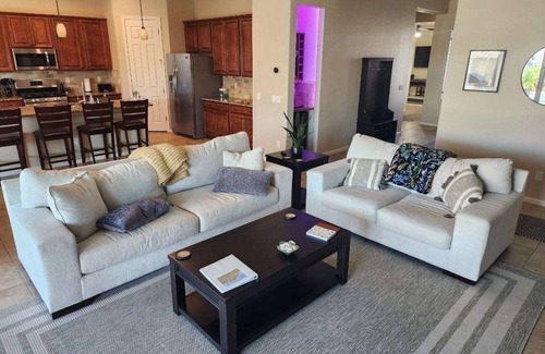Bring the whole family to this centrally located home with lots of room for fun. Pool, putting green, games & more. A true an oasis in the desert. Close to target, shopping and restaurants. NO PARTIES! Pool heating is an additional$60 per day