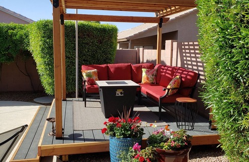 Welcome to our Charming Getaway in Surprise Arizona! This 3BR/2BA home has a lot to offer, from the tastefully furnished and decorated interior to the backyard outdoor oasis. This home includes all of the necessary items you'll need to feel comfortable and have a peaceful, relaxing vacation. A fully equipped kitchen available for convenient preparation of your favorite home-cooked meals. The 8 foot hedge around entire backyard provides an intimate retreat, including a sparkling pool that can be heated in the cooler months. A redwood pergola with seating and a fire pit table. Dine al fresco, with the gas BBQ and patio dining set. Enjoy the tiki themed bar with plenty of bamboo, colored lights and fun decor. A great place to soak up the sun and unwind during the day and entertain guests during the evening. We are located in the heart of the Cactus League Stadiums and are a 6 minute drive to the Kansas City Royals and Texas Rangers facility. Perfect spot for the family when in town for tournaments. A golfers heaven, with 9 golf courses in Surprise and another 57 within 20 miles of the city. For automobile aficionados, Barrett Jackson, Mecum, and Sterling auto auctions are nearby. There are car shows and cruise ins almost every weekend. There are so many things to do, Casinos, Hiking, Tennis, Pickleball, etc. Nearby we have The White Tank Mountain Regional Park, Wildlife World Zoo, Aquarium & Safari Park and Lake Pleasant Regional Park, State Farm Stadium, Top Golf, Desert Diamond Casino and much more. These are all great places to spend the day! We have taken great care in every detail to create a perfect vacation escape. We invite you to experience one of our favorite places. Please do not hesitate to reach out if there's anything that would help make your stay more enjoyable.