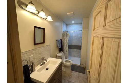 The bathroom has a mirror, sink, toilet and shower. Other items for guests are included in vanity: soap, shampoo/conditioner, hair dryer, etc.