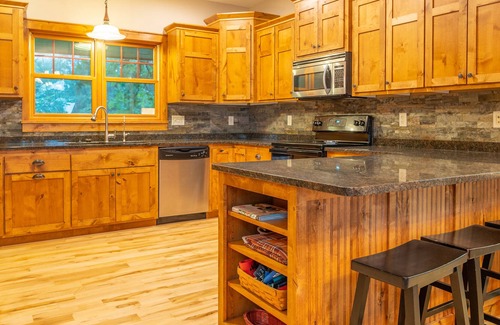 A beautiful lakefront property on a small private lake, with magnificent views, large spacious kitchen and living areas. This cabin is located on 3 acres, with 225 feet of lake shore. The area is quiet and serene. There is also a crafting space that has 10 work stations, with office chairs for comfort. Come visit, enjoy the peace and quiet of the lake, go shopping for art and antiques, visit local wineries, downhill skiing and zipline parks are close, along with a fun outside waterpark. The Lodge sleeps 8. A must see!