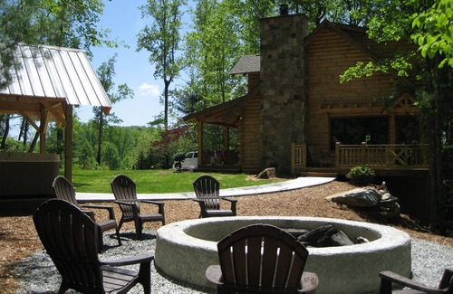 Beautiful log cabin very private with abundant hardwood tree and mountain laurel with views out every window of surrounding mountains, kitchen has granite counter tops and new stainless steel appliances, the whole cabin has new furniture with some custom pieces, floor to ceiling wood burning real rock fireplace, ash hardwood flooring on main level, has a large master bedroom with king size bed, the master bath has imported stone flooring, marble counter top on vanity with large stone tile shower and 6' free standing cast iron tub. Both bedrooms have flat screen TVs also large upstairs loft area with sectional sofa and a 52 inch flat screen TV all TVs are hooked up to Dish Network, upstairs bedroom has a queen size bed with upstairs bathroom which has a tub shower combo with stone tile flooring and granite counter top on vanity, the downstairs living room has a pull out sofa. This cabin lets you also bring the living outside with a large front porch and side deck just off of this deck is a large custom fire pit, picnic area with park like grill (charcoal) and covered hot tub area. This cabin is non smoking and no pets!