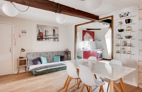 Our accommodation is located in a beautiful historic building in stone and timbered in the heart of the pedestrian streets of the city center (Rue Mirebeau). The apartment has a large living room open to the kitchen, bright and crossed by long beams.