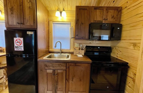 This custom-designed 100% wood timber cabin offers two bedrooms with a loft and can sleep a total of 10 guests. Full kitchen, new appliances, walnut cabinets and custom wood furniture, dark oak stain finish. BBQ pit, fire pit, and picnic tables for outdoor activities with the family. Everything is brand new!