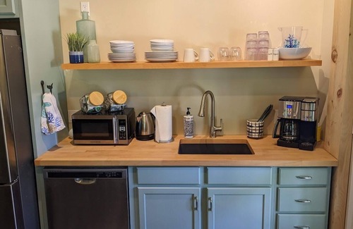 Lower level has large family room with propane fireplace and sectional seating for 8, 60 inch TV with sound bar, banquette seating for 6, kitchenette with microwave, full size stainless refrigerator with filtered water and ice, coffee pots (brewed and K-cup), and dishwasher. Lower level has two bedrooms. The larger bedroom has a work station with desk and chair. Smaller bedroom has a triple bunk with a double bed and two singles. Large bathroom with double vanity and walk in shower with two shower heads. Stacked high capacity washer and dryer in hall. Enjoy the outdoor hot/cold shower on lower deck and the 7 person hot tub after a fun-filled day at the beach.