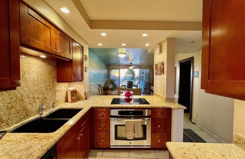 This unit is beautiful, with tile flooring throughout, cherry cabinets, granite countertops, and stainless appliances. An enchanting mural by famous Hawaiian artist Lanakila, depicting the legend of the creation of Maui, adorns the living room wall. The unit is spotless and meticulously maintained. Tropical style ceiling fans are located in the living room and both bedrooms. In addition, tri-zone A/C is located in each bedroom and main living area. High speed WiFi is provided for your convenience free of charge. Amenities within the Royal Mauian complex include an oceanside heated pool and rooftop barbecue area. The condo is only steps away from your favorite beach activities and across the street from great lunch spots, dining, and shopping.