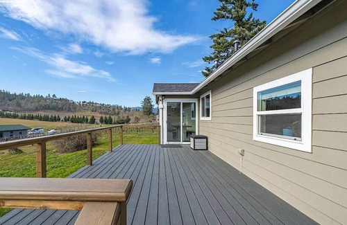 Take it easy at this unique and tranquil getaway. This three-bedroom two-bath home has been completely remodeled. Relax on the back porch and sip on one of the many local wineries within walking distance. This home is located on the outskirts of Medford but minutes from downtown Jacksonville. The living room has an electric fireplace with amazing views of the wine country hillsides. Close enough to town to have great wifi while in a country private setting.
