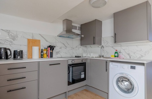 Modern, functional, and recently refurbished, the kitchen has been thoughtfully designed to meet your cooking needs. Ample counter space and cupboard storage make the kitchen ideal for longer stays, and with chic flooring and a marble effect backsplash, this space is a joy to be in. You'll find a hob, oven, microwave, kettle, toaster, fridge, freezer and an air fryer —plus utensils, pots, and pans required for preparing meals at home - what more could you need? There's also a dishwasher and washing machine to make clean-up quick and easy. Whether you're preparing a full family dinner or just storing snacks, this kitchen makes it simple and stress-free.