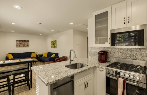This 1939 home has porcelain plank floors, Shaker cabinets, granite counters, and stainless appliances. It has a fenced yard and a BBQ. The living room and both bedrooms have TVs with streaming WiFi connections. The home has a thick, acoustically insulated common wall with the adjacent Carriage House.