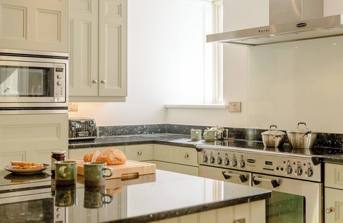 Bathroom: Bath, Cubicle Shower, Heated Towel Rail, Toilet. Oil central heating, electricity, bed linen, towels and Wi-Fi included. Initial fuel for multi-fuel burner included. Travel cot, highchair and stairgate included. Welcome pack. Enclosed garden with terrace and garden furniture. Private parking for 1 car; additional on road parking. No smoking. Please note: There are 8 steps in the garden.. With meticulous attention to detail combining traditional style with contemporary, Church Manor offers the perfect luxury getaway in the heart of Yorkshire. The arched front door opens into a stone flagged hallway, opening up into a fabulous kitchen, with stylish shaker-style units, granite worktops, large island and an electric range. Open plan with a large dining space, this is a great room for entertaining. Double doors lead into the spacious living room, complete with contemporary multi-fuel burner and a 50" Smart TV. Arched church windows bring in the views across the Yorkshire Dales in all the downstairs spaces, and glass flooring in the upstairs window recesses allow the light to flood in. To the rear of the hallway is a small snug which can be used as an office or games room.