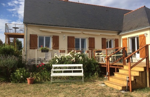 This is a first floor studio apartment with stunning views and outside balcony for alfresco dining, or just watching the sunset. It has a further family bedroom across the landing which has one double and two single beds sleeping 4 people, it has its own large bathroom with bath & shower plus table/chairs and small fridge.( this incurs additional cost) The main room is newly refurbished and is quite spacious with large double bed, fully equiped kitchen area with fridge/freezer. Shower room ensuite. Comfortable sofa with tv and plenty of storage for clothes. Situated on the edge of a village and within an easy 22 mins drive to the lovely town of Saumur on the Loire river, well known for excellent wines and local chateaux.