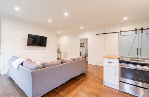 The washer and dryer are located behind the sliding barn-doors should you need to use. In this nook, we have 4 folding chairs that can be pulled out and paired with our drop-leaf table should you need more eating space or choose to eat at the kitchen bar. There is a sectional sofa to spread out on and a smart tv for guests to watch their preferred streaming account once logging into our smart TV (guest mode will automatically log you out as well).
