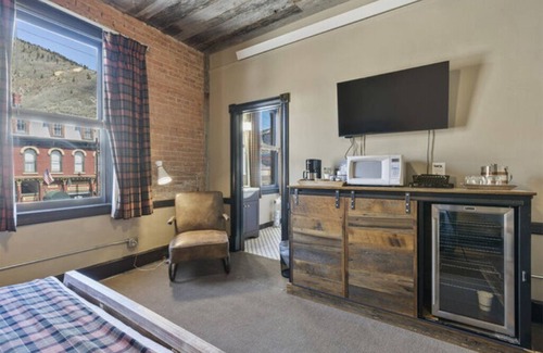 Step away from the ordinary at this unique hotel suite at the Benson Lodge in historic downtown Silverton, Colorado. Featuring high ceilings, warm wood accents, and exposed brick, you and your guests will have all the comforts of home while visiting the San Juan Mountains. Additional amenities include a kitchenette for brewing up your morning coffee and storing or reheating leftovers, a jetted tub shower combo, complimentary internet access, a cable-equipped, flatscreen smart TV and access to shared laundry facilities, a business center, and on-site conference rooms.