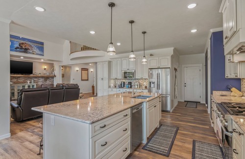 On this main floor is a large living room with comfortable seating for 10+with an open floor plan that has a very large chefs kitchen with 36" commercial cook range and double ovens, 10 foot island and coffee bar.