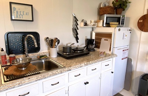 We have transformed part of our house into a separate one bedroom apt with kitchenette, living and brand new bath. Private entrance to suite is through new porch. The cozy 300 sq ft 1 bedroom apartment is fully stocked.