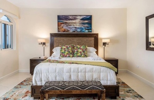 Beyond the double doors of this lower-floor luxury air-conditioned King bedroom are unobstructed views of the Caribbean Sea and the entire Beyond the Sea property. With a large ensuite bathroom, walk-in shower, ceiling fan, and individually climate-controlled unit, guests are transported to a tranquil and modern experience. Enjoy thoughtful amenities, including a hair dryer, safe, flat-screen Smart TV, work desk with multiple outlets, Keurig machine, mini microwave, minifridge, and more. A pool spa jacuzzi combo is 20 ft away—max occupancy of 2 guests.