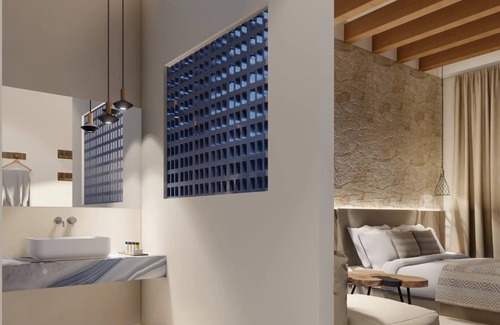 This modern apartment features bright natural colors and symbols of the Sun – which is so important for perfect holidays in Rhodes. Its earthly décor with rock elements and exposed wood add to its charm. The room is suitable for 2-3 adults as well as families of 3. It has a separate bathroom for those preferring some privacy. There is also a little kitchen area and a balcony.