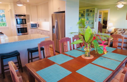 This lovely and breezy house is furnished with vintage Hawaiian charm. It has three bedrooms, two bathrooms (one with a tub/shower and one with a shower), a large living room, and a dining room that seats 8. The newly remodeled, fully equipped kitchen is a chef’s dream, with a 6 burner gas cooktop, a double oven, one of which is convection, a dishwasher, and a view. The kitchen has counter seating but you will probably have your coffee on the spacious lanai. The home is equipped with WiFi internet, three TV’s, Roku with Netflix and Hulu. One bedroom has a king sized bed, one- a queen, one- two twins, and there’s a convertible double futon couch available in the living room. It comfortably sleeps 6-8. We’re equipped with a washer and dryer, detergent included. It has a lovely garden with an outdoor shower for when you get back from beach. Come home and breathe in the fragrance from the mature Plumeria trees which surround the home.